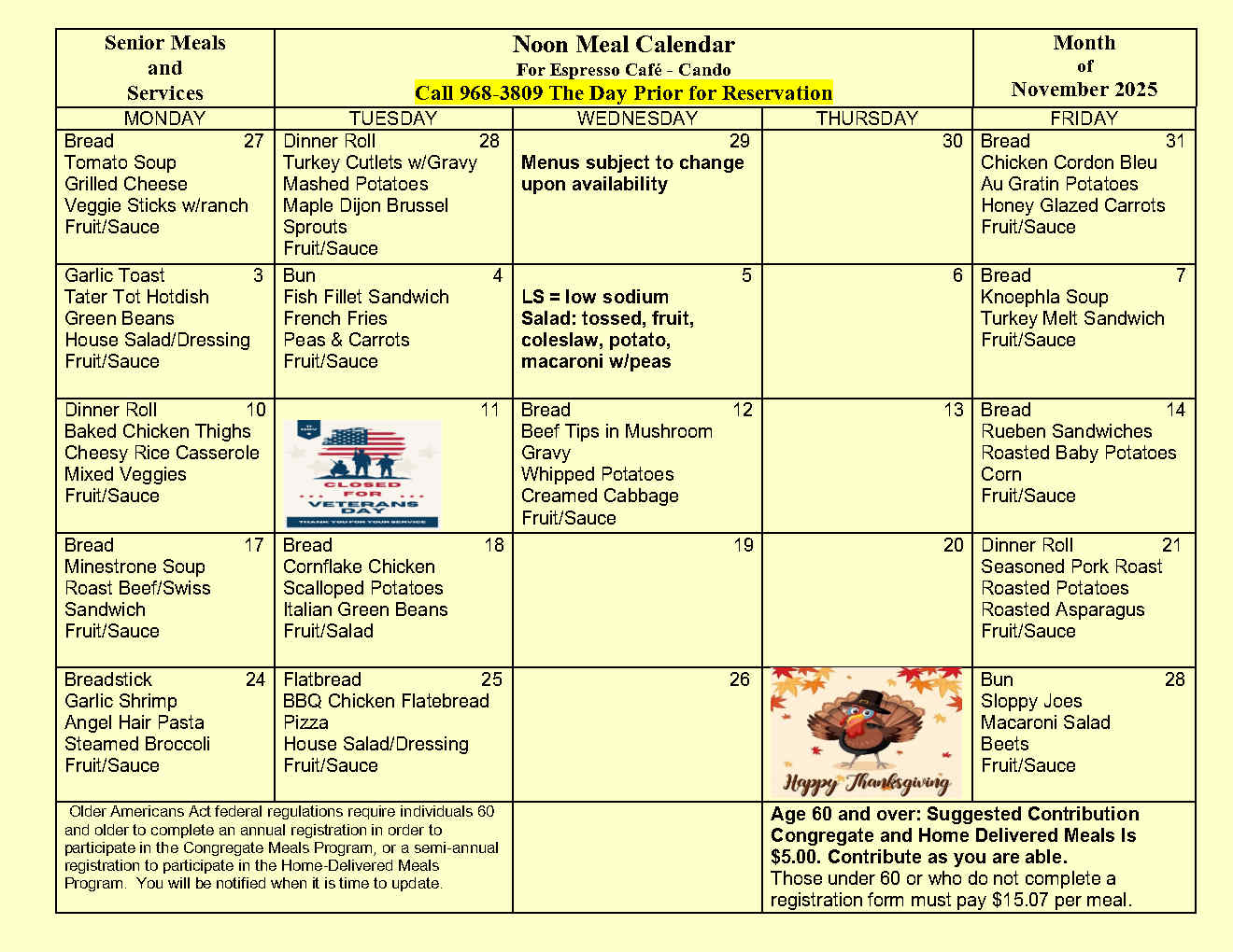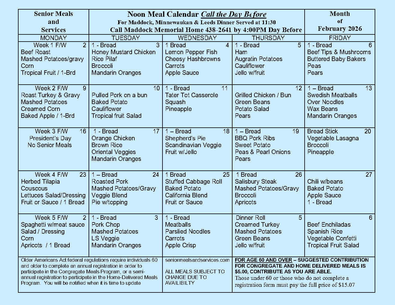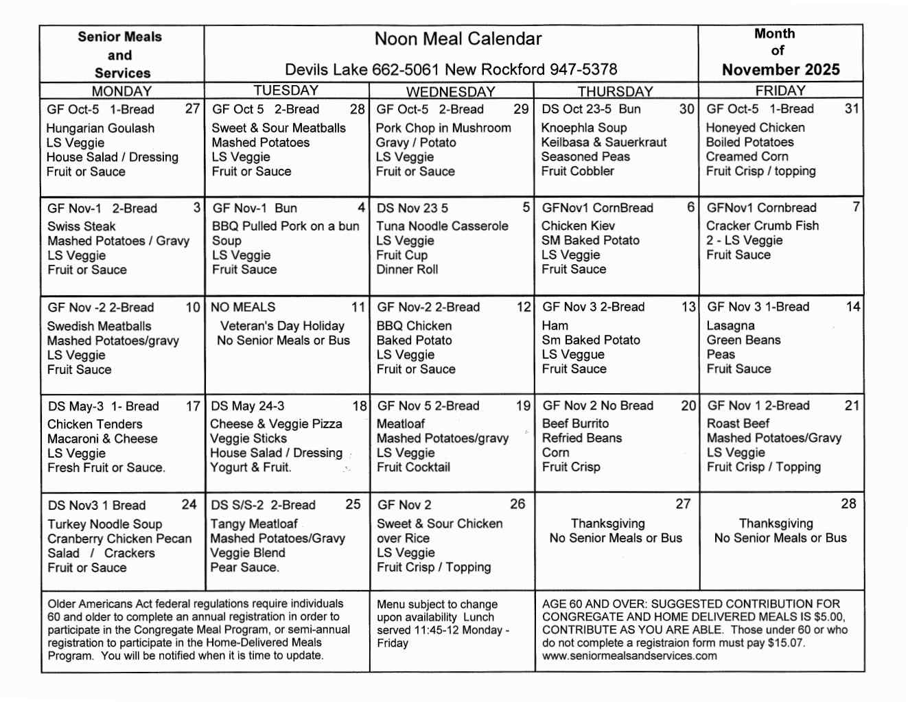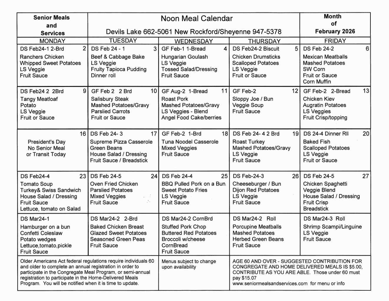Frozen Meals and Soups are available. Call 701-662-5061 for more information.