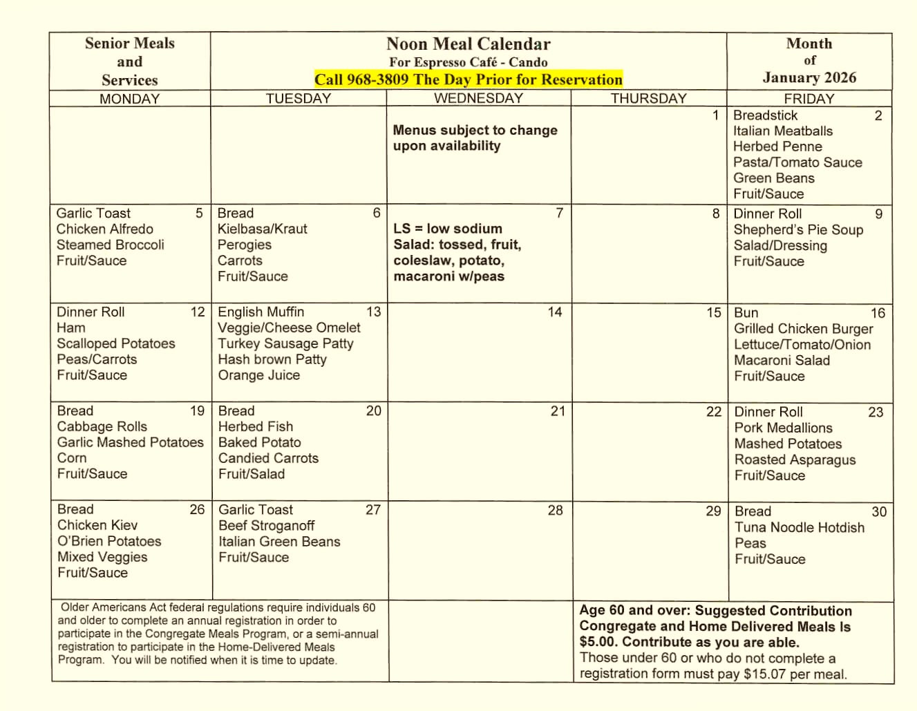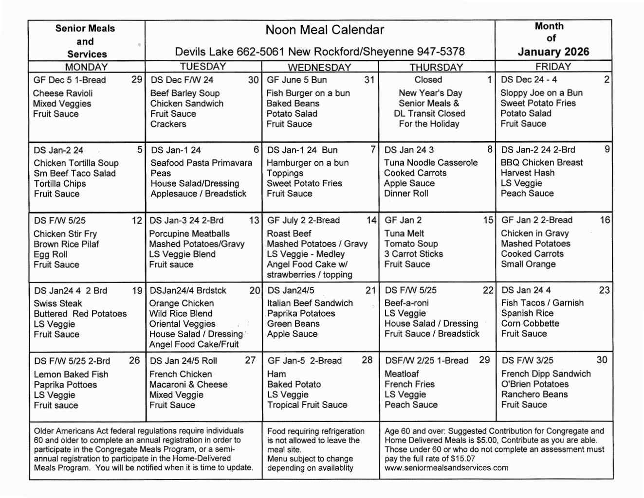 Devils Lake January 2026 Menu (Printable)