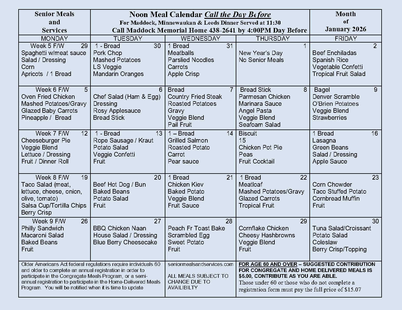 Maddock January 2026 Menu (Printable)