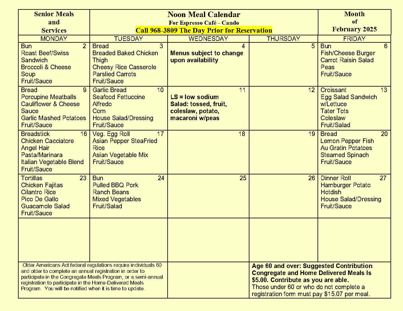 Frozen Meals and Soups are available. Call 701-662-5061 for more information.